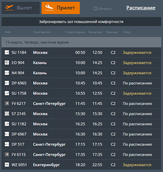 Прилет авиарейса из Казани EO 904 перенесли с 10.00 на 14.25, WZ 6951 Екатеринбург – Волгоград – с 18.20 на 22.55.