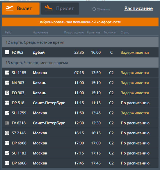 Также пришлось отложить вылеты по некоторым направлениям. Самолет из Волгограда в Дубай отправится в 16.00 вместо 23.35 (12 марта). Также задерживаются перелеты в Москву и Казань.
