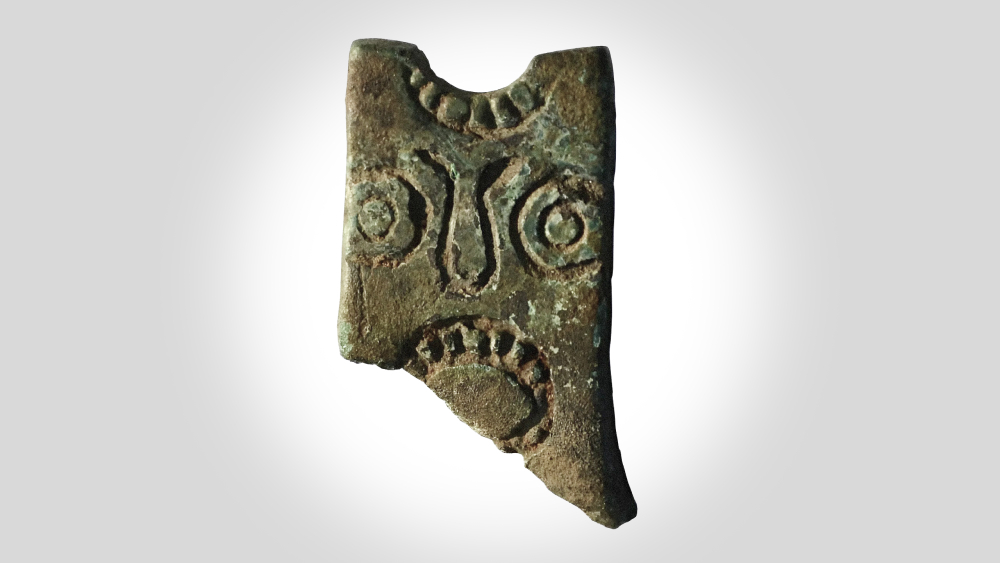 Одна из накладок уникальна: на ней владелец сумки или изготовивший ее мастер прочертили схематичное портретное изображение — личину. Не исключено, что это автопортрет.