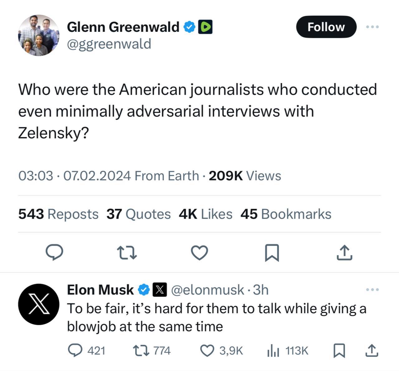 Илон Маск ответил на вопрос, есть ли журналисты, которые брали у Зеленского острые интервью