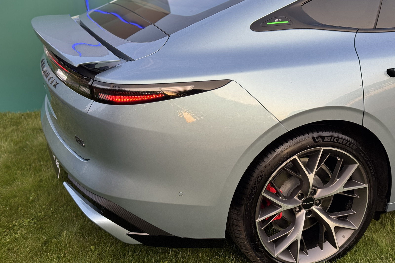 Боковины ES украшены оригинальными тёмно-серыми колёсными дисками, за которыми видны красные тормозные суппорты, кроме того, в профиль видны выдвижные дверные ручки. Монофонарь выполнен в виде широкой полосы, которая проходит от одного заднего крыла до другого через всю ширину крышки багажника, а на её кромке находится активный спойлер.