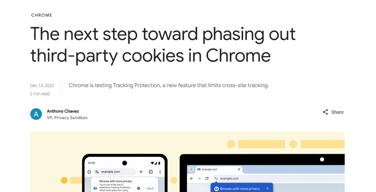 4 января Google отключит сторонние cookies в Chrome для 30 млн человек — 1% пользователей браузера. Так компания начнет тестировать новую функцию защиты от отслеживания. План Google — во второй половине 2024 года отказаться от сторонних cookies вовсе.