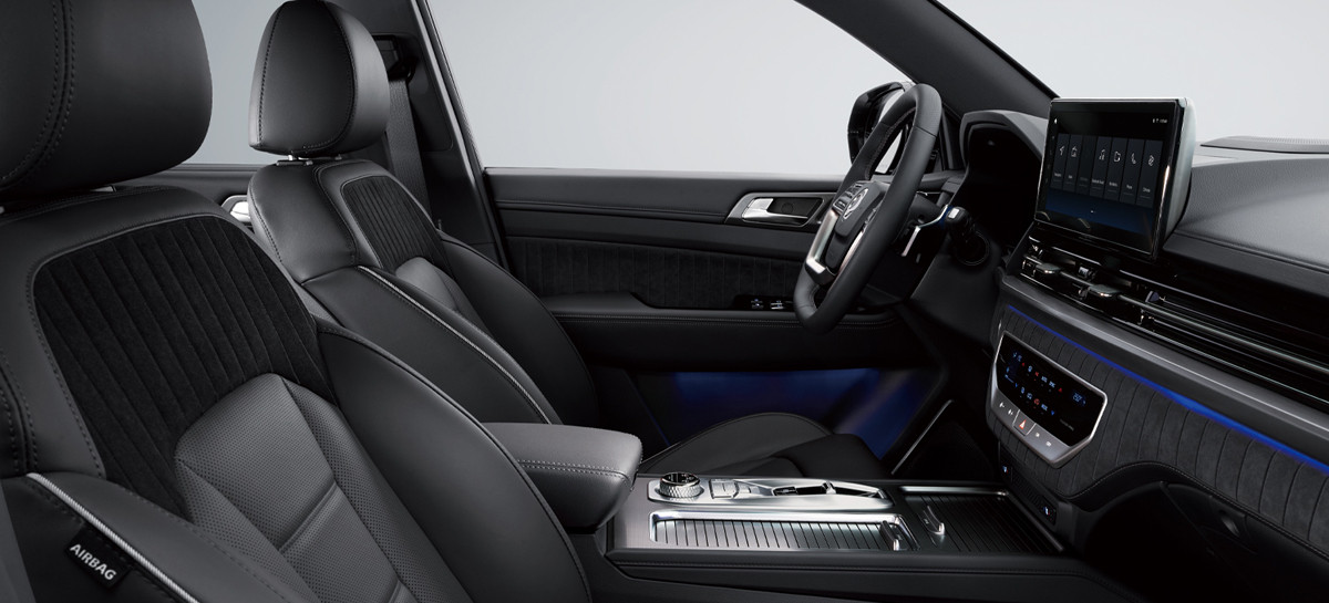 Салон KGM Rexton рассчитан на пятерых седоков, на передней панели располагается виртуальный щиток приборов диагональю 12,3 дюйма. Аналогичная диагональ у тачскрина информационно-развлекательной системы с русифицированным интерфейсом, поддержкой Apple CarPlay и Android Auto. Внедорожник снабдили атмосферной подсветкой салона, подогревом рулевого колеса, а также электрорегулировкой, подогревом и вентиляцией передних кресел.