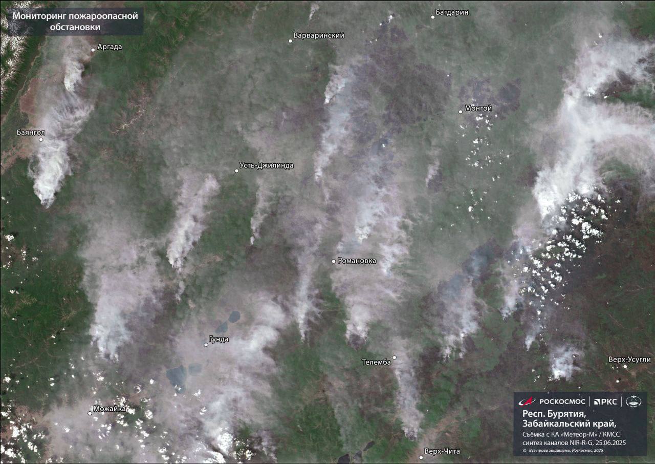 Лесные пожары в Забайкалье попали на кадр из космоса. Его опубликовали в Telegram-канале "Роскосмоса". Ранее сообщалось, что лесной пожар возле поселка Атамановка в Забайкалье локализовали на территории 7 тыс. га.