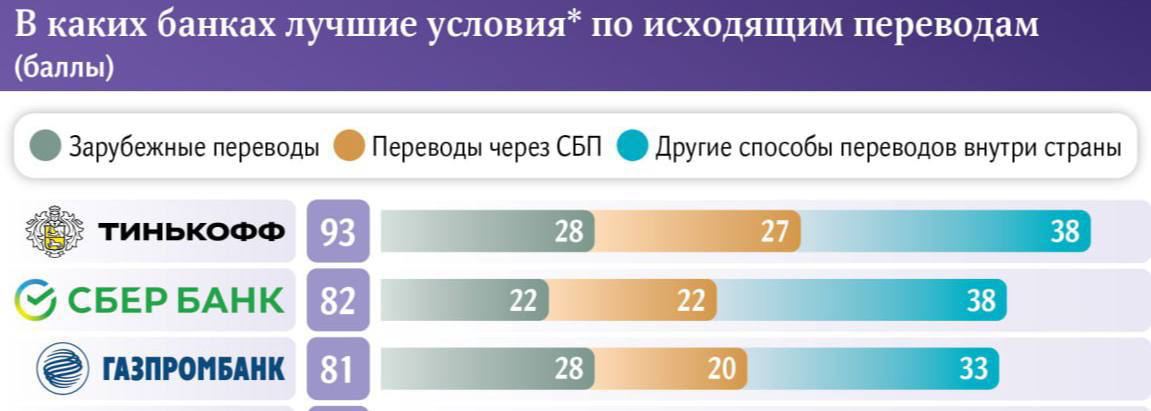 Исследователи отмечают, что по сумме факторов лучшие условия исходящих переводов предоставляет Тинькофф. В частности, отмечают, что банк в принципе не берет комиссию за транзакции по реквизитам, номеру телефона и СБП, кроме того, именно эта кредитная организация предлагает широкий ряд опций и валют для международных переводов.