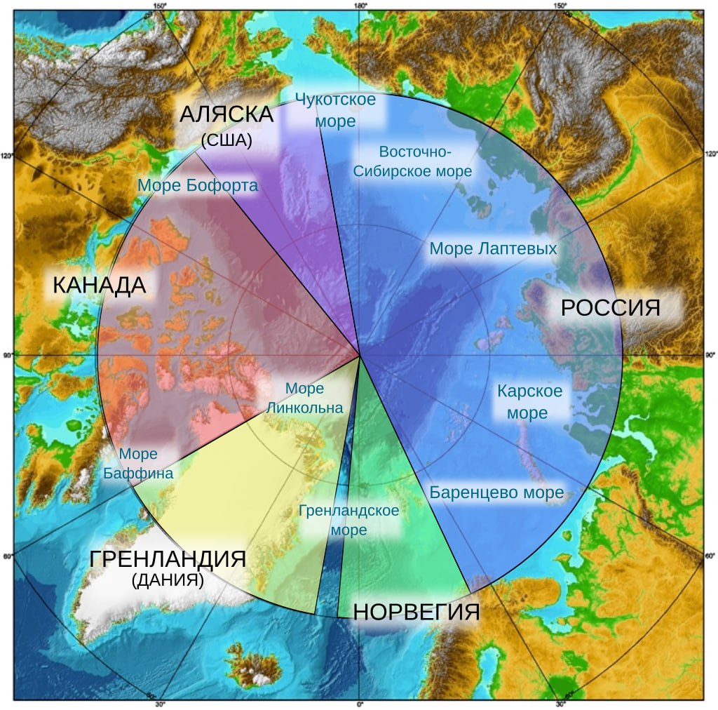 И чтобы наглядно, на карте: деление Арктики согласно секторальному подходу на пять зон: российскую, американскую, канадскую, норвежскую и датскую (датская за счёт Гренландии)