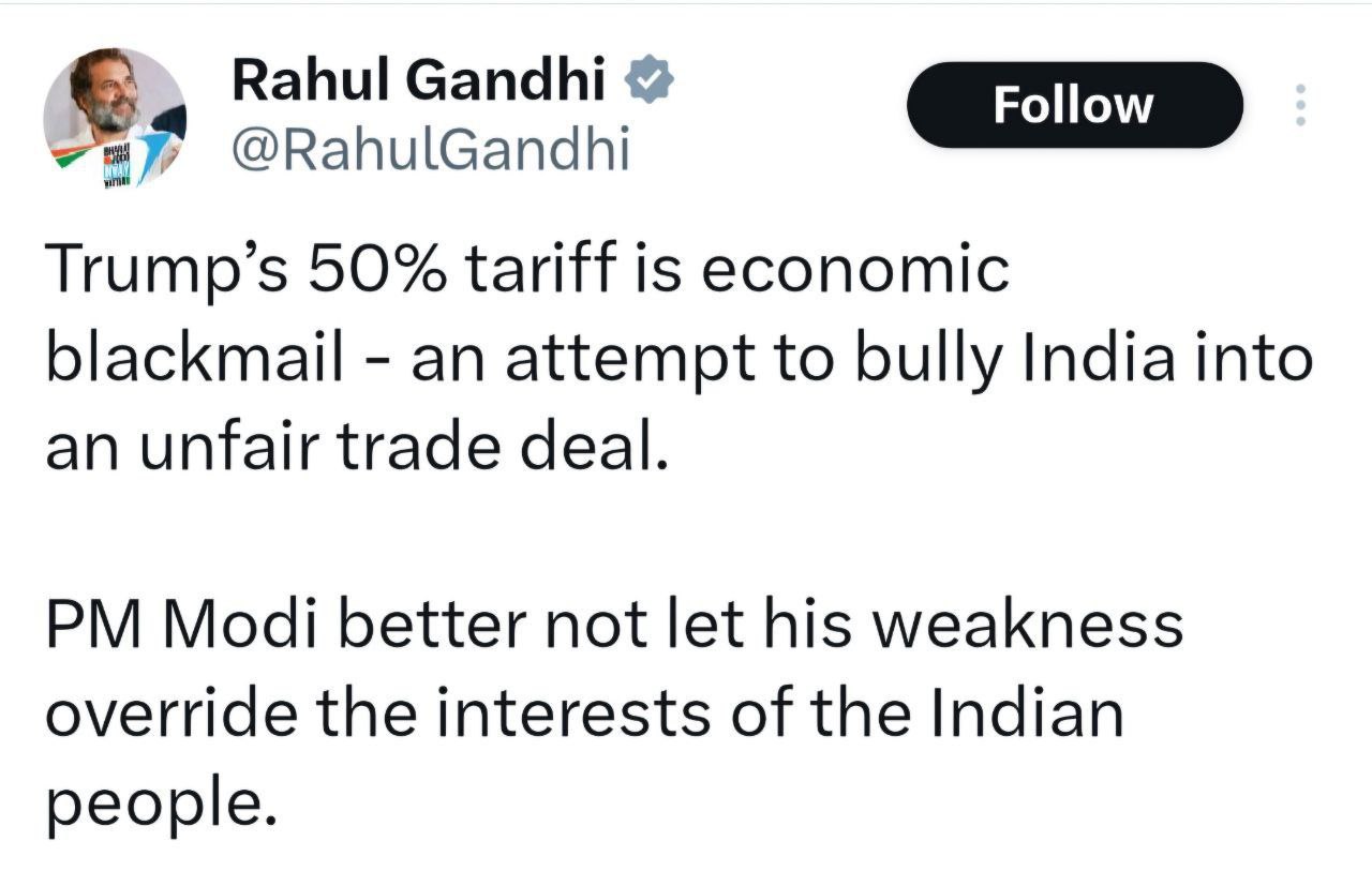 "50-процентный тариф Трампа - это экономический шантаж, попытка вынудить Индию заключить несправедливую торговую сделку..."
