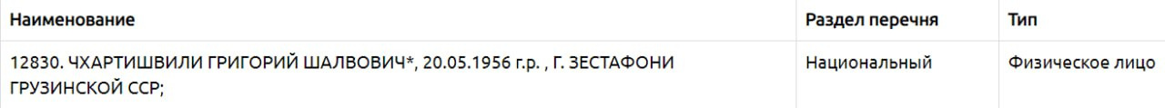 Писатель, литературовед и переводчик, автор книг про Эраста Фандорина Борис Акунин* (настоящее имя – Григорий Чхартишвили) внесен в реестр террористов и экстремистов. Его имя появилось в списке Росфинмониторинга 18 декабря.