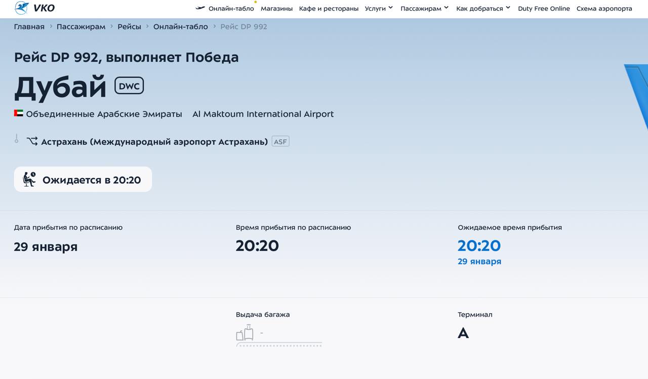 На сайте аэропорта Внуково рейс «Победы» из Дубая стоит запланированным к посадке в 20:20 мск.