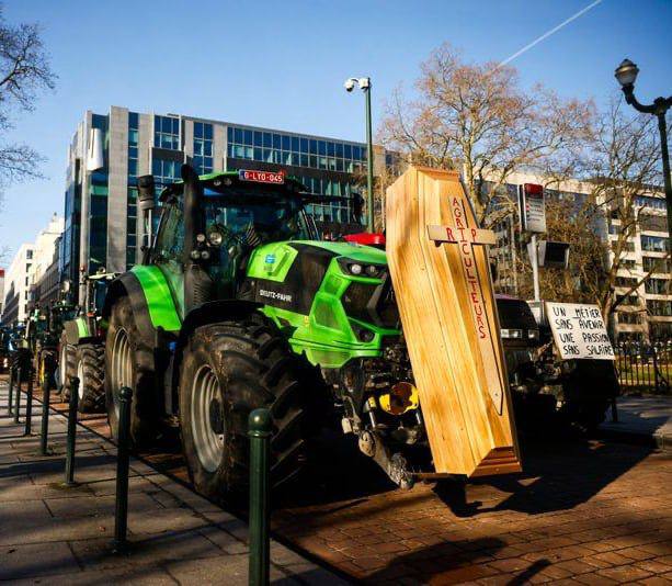 Покрышки, навоз и гроб: фермеры вышли на новую акцию протеста в Брюсселе.