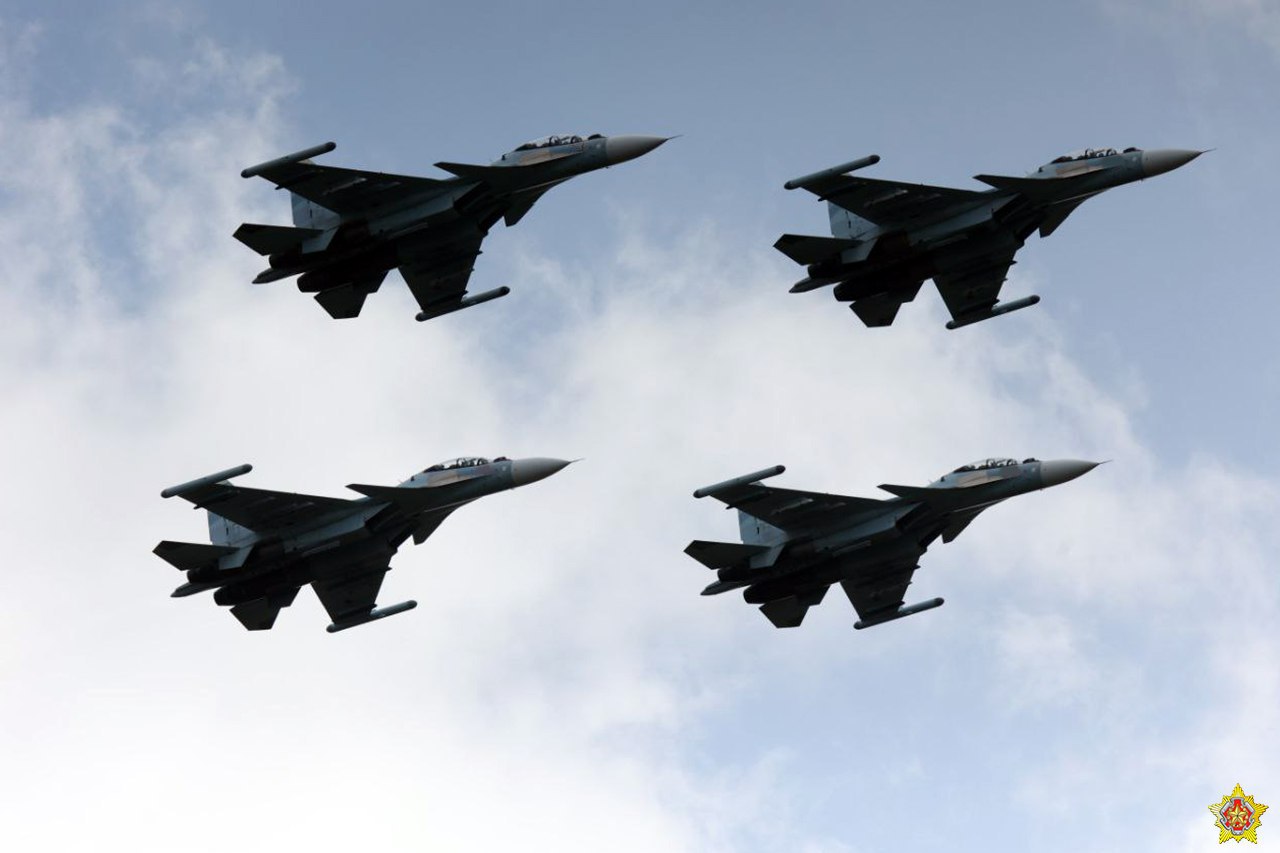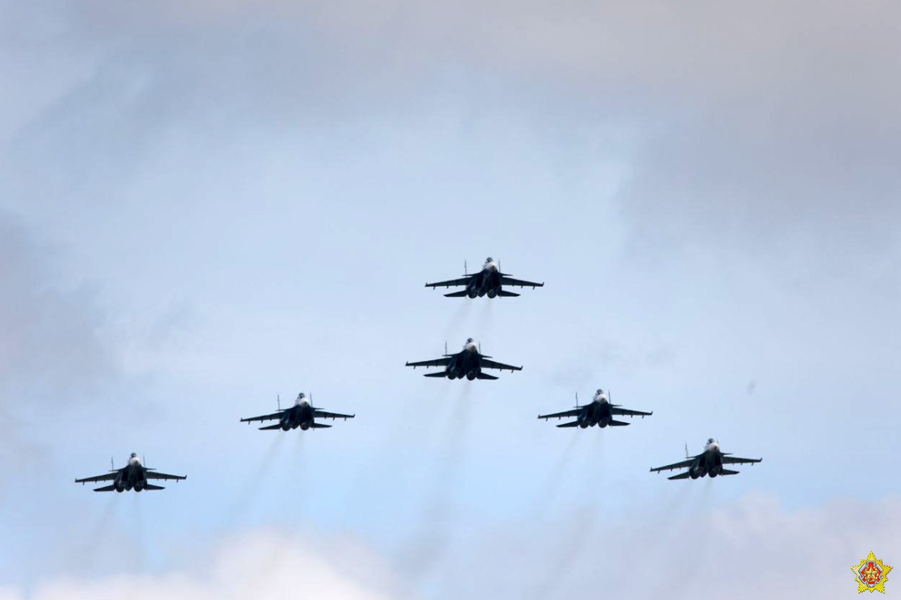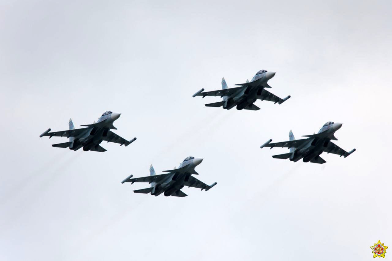 В небе над Минском проходит первая тренировка воздушной части военного парада, посвященного 80-летию Победы в Великой Отечественной войне.