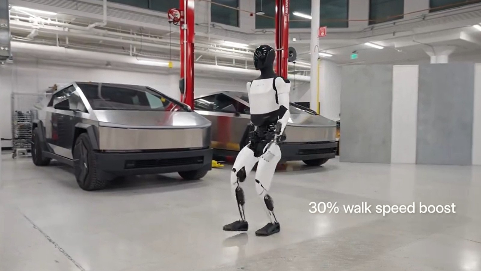 Optimus Gen 2 выглядит элегантнее своих предшественников, наружная обшивка уже вполне товарная, осталось только чем-то прикрыть тазобедренный сустав. Лица у робота по-прежнему нет, но это дело тоже поправимое. Главное, что робот, снабжённый кучей датчиков и актуаторов, стал проворнее. Скорость ходьбы увеличилась на 30%, но Optimus по-прежнему выглядит довольно медлительным и к быстрым танцам пока не готов. Масса снизилась на 10 кг за счёт оптимизации конструкции, но сколько именно килограмм сейчас весит Optimus, компания Tesla не сообщает.
