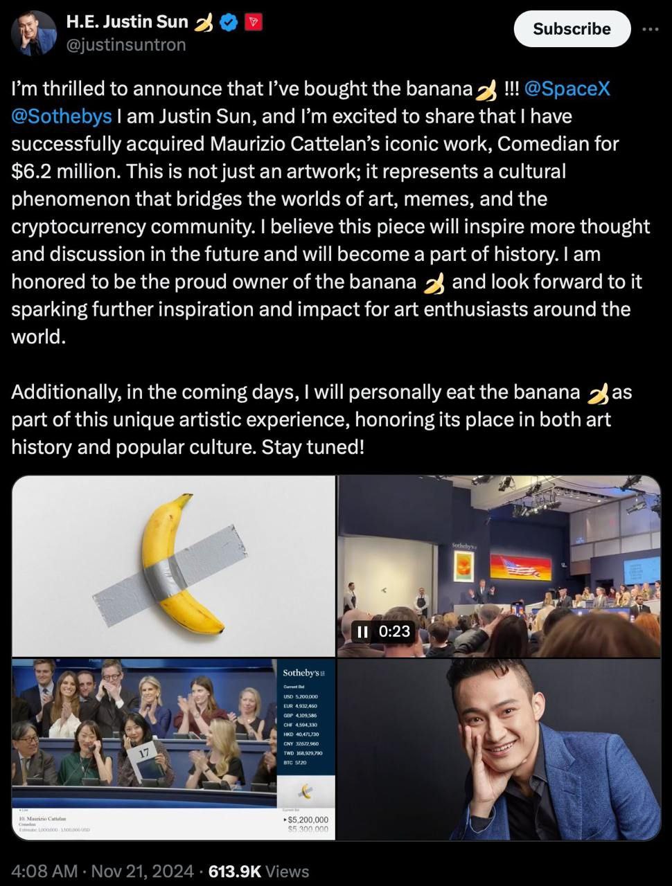 Приклеенный к стене банан купил за $6,2 млн глава криптокомпании TRON Джастин Сан. По его мнению, это не просто произведение искусства: оно представляет собой культурный феномен, который связывает миры искусства, мемов и крипты. Он добавил, что в ближайшие дни съест банан «отдавая дань уважения его месту как в истории искусства, так и в культуре».