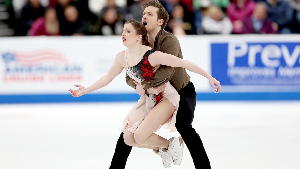 Неожиданно высоко поднялись Эмили Зингас и Вадим Колесник, взяв бронзу. Видно, что на эту пару американская федерация делает большую ставку. Уже в начале сезона они уверенно обходят более опытных соперников, хотя вместе катаются недолго. Ритмический танец для этого дуэта слишком клишированный. Видно, насколько фигуристы танцевальные и экспрессивные, но и музыка, и хореография сильно загоняется под стандарты. Похожие постановки зрители уже видели, хотя эти спортсмены могут показать намного больше. Не обошлось и без ошибок — на твизлах Вадима немного шатало, так как этот элемент поставили в конце.