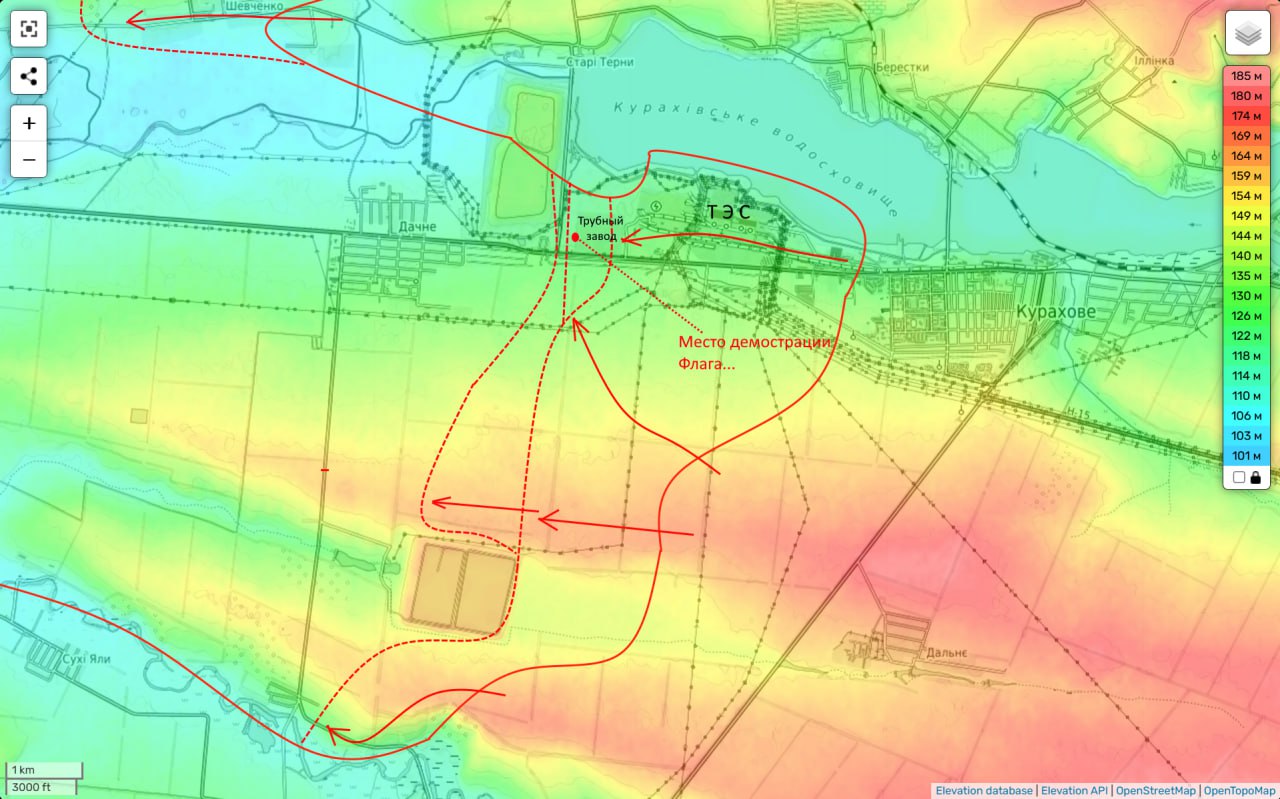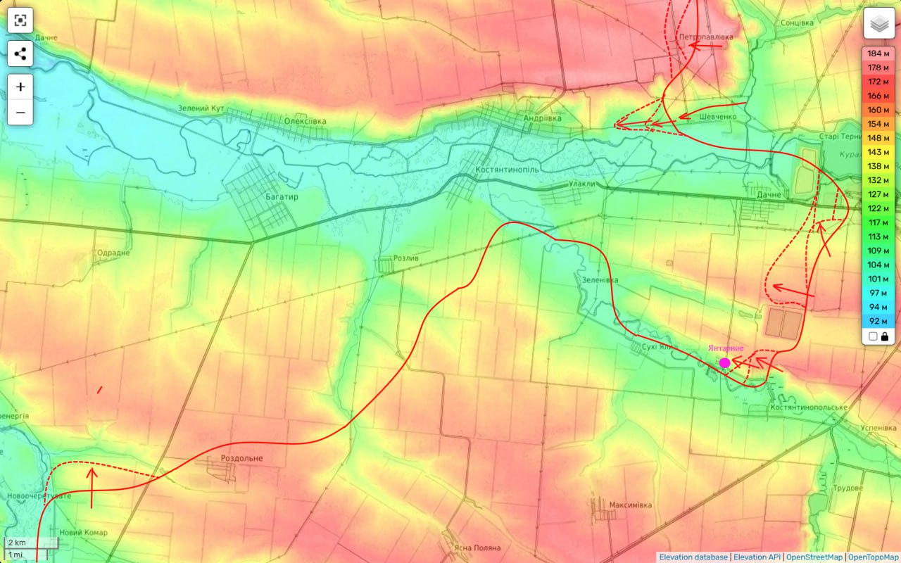А с востока наш накат на этот рубеж нарастает. Уже идут бои в Янтарном, которое к тому же, после сдачи оставшейся части Курахово, обходится с севера. То есть с тыла. Жа и в Дачном, теперь обстановка для ВСУ сильно усложнилась. В т.ч. и потому, что части 114-ой бригады севернее заняли опорники противника на высоком северном берегу р. Волчья и с них работают по трассе Запорожье-Курахово, которая является для них единственной дорогой жизни.