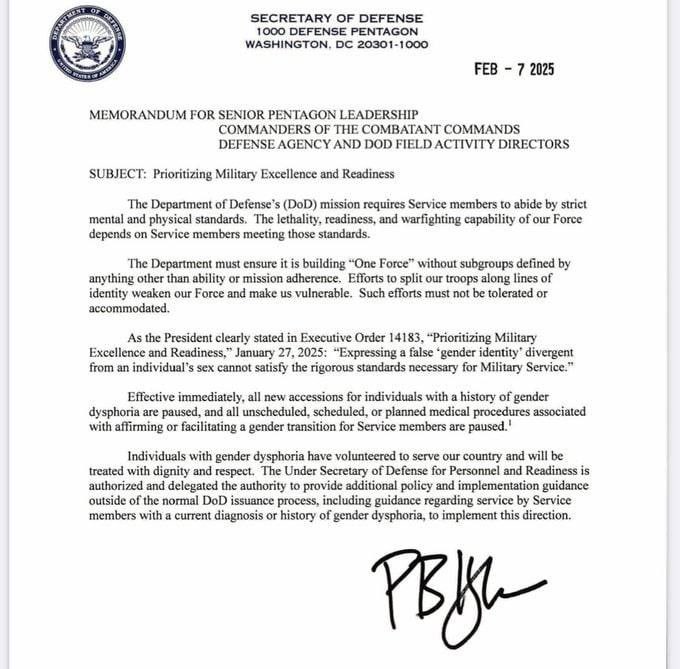 Министр обороны США Пит Хегсет официально запретил приём на военную службу трансгендеров или лиц, имеющих подобную медицинскую историю.