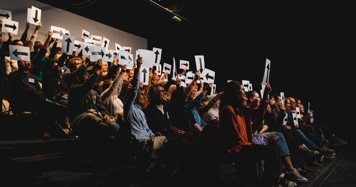 À l'entrée de la salle, le spectateur reçoit une planche en plastique représentant une flèche noire. À peine assis, il est ensuite invité à répondre à des questions qui s'affichent en direct sur un tableau vidéo. Quelle est la phrase qu'on a le plus entendue comme élève? On oriente notre pancarte en fonction de notre réponse. Après La Convivialité ou La faute de l'orthographe (2019), Arnaud Hoedt et Jérôme Piron, respectivement ex-professeurs de français et de géographie s'attaquent au système scolaire. Selon eux, le choix de l'école détermine le parcours des êtres humains et fait naître les inégalités sociales.