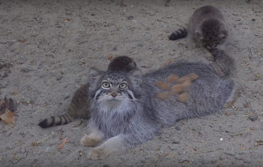 Котята манула Евы активно познают мир и выходят на прогулки в Новосибирском зоопарке. Один из них решил поохотиться за хвостом мамы. Ева проявила максимальное терпение.