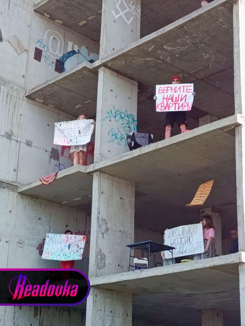 На деле многоэтажка так и осталась бетонной коробкой, а около 200 семей — без жилья. За эти годы дольщики устраивали перформансы с манекенами, перекрывали улицу Интернациональную, ходили по переходу кругами. Теперь здание собираются снести. Появился потенциальный инвестор, который готов выплатить компенсации. Пока же жители «обустраивают» свои квартиры в руинах.