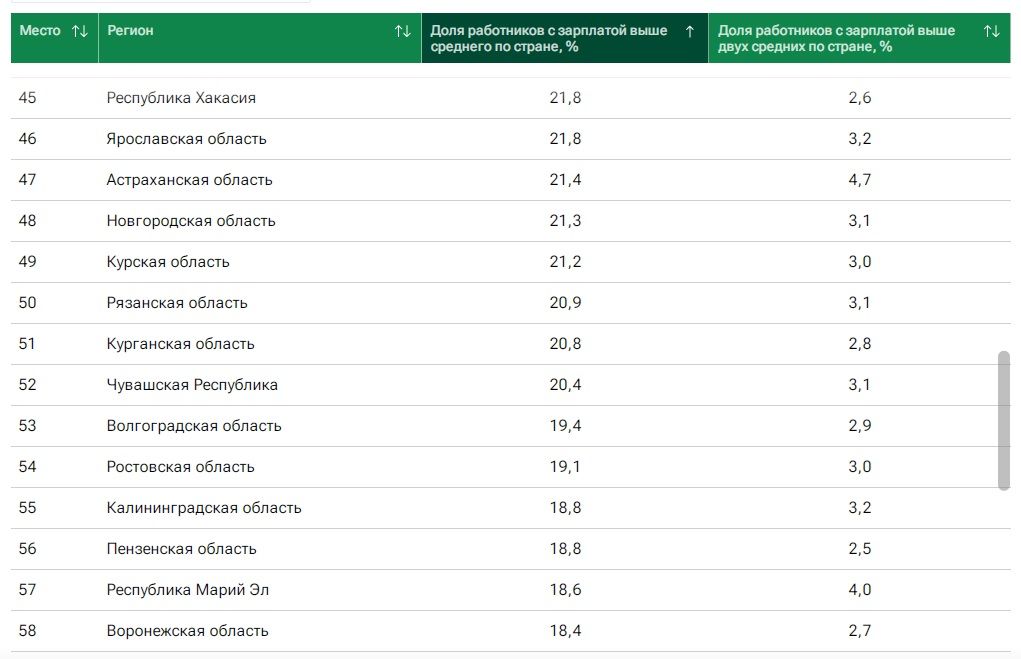 Оценивали процент работников в регионах, заработная плата которых выше среднего по стране, и долю работающих местных жителей, чья зарплата выше двух средних. В Воронежской области эти показатели составили 18,4% и 2,7% соответственно.