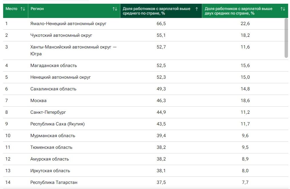 Москва и Санкт-Петербург оказались на 7-м и 8-м местах. В столице России уровень зарплаты составил 46,3% и 18,6%, а в Петербурге — 44,9% и 11,2%.