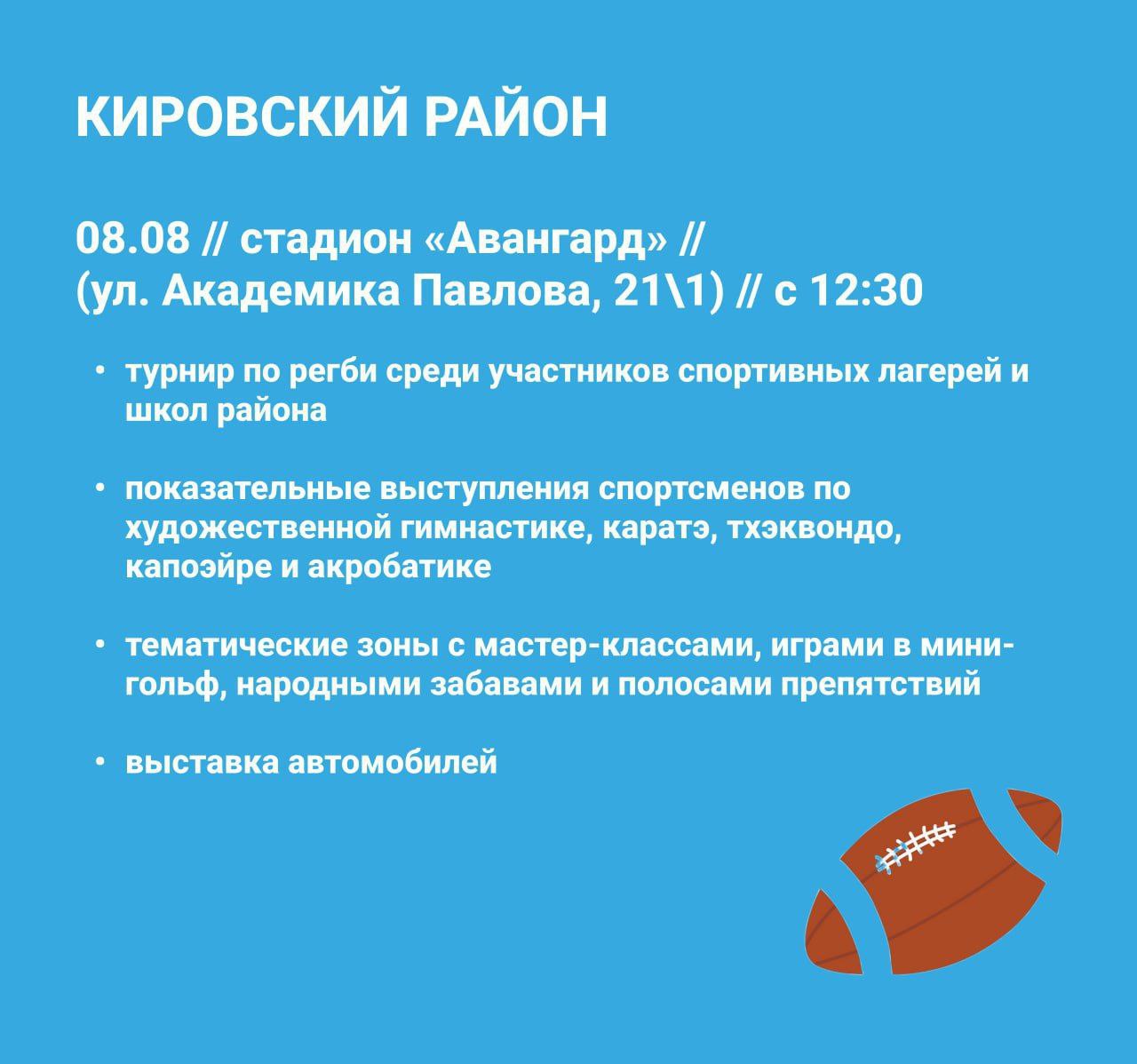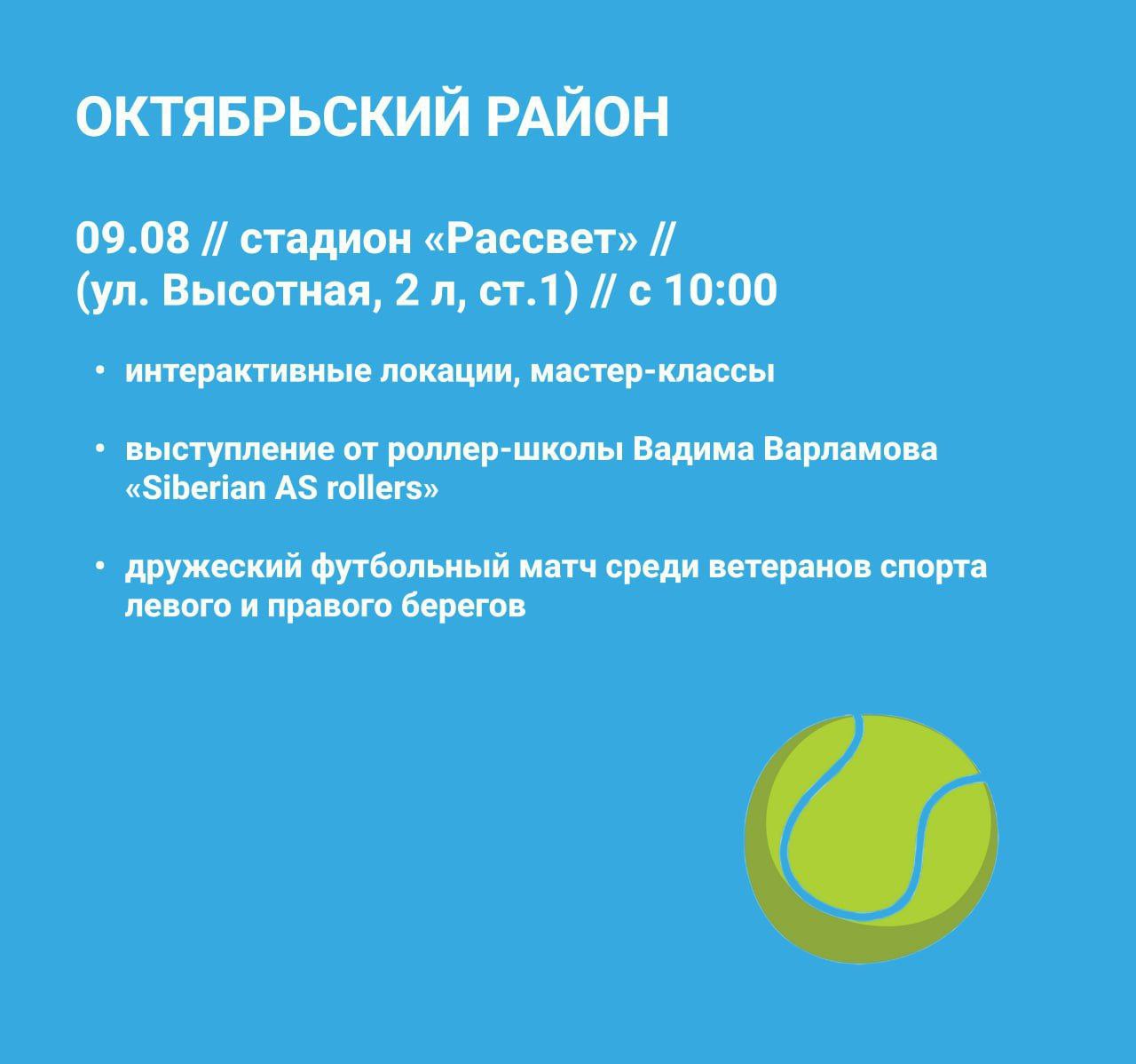 Праздничные мероприятия пройдут на острове Татышев, а также в Кировском, Октябрьском и Советском районах Красноярска. С 8 по 9 августа жителей ждут турниры, мастер-классы, спортивные зоны и зрелищные шоу.