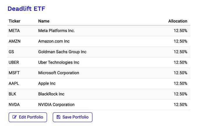 Фонд получил название Deadlift ETF и состоял из 8 компаний: Nvidia, Apple, Meta, Amazon, Uber, Microsoft, Black Rock и Goldman Sachs.