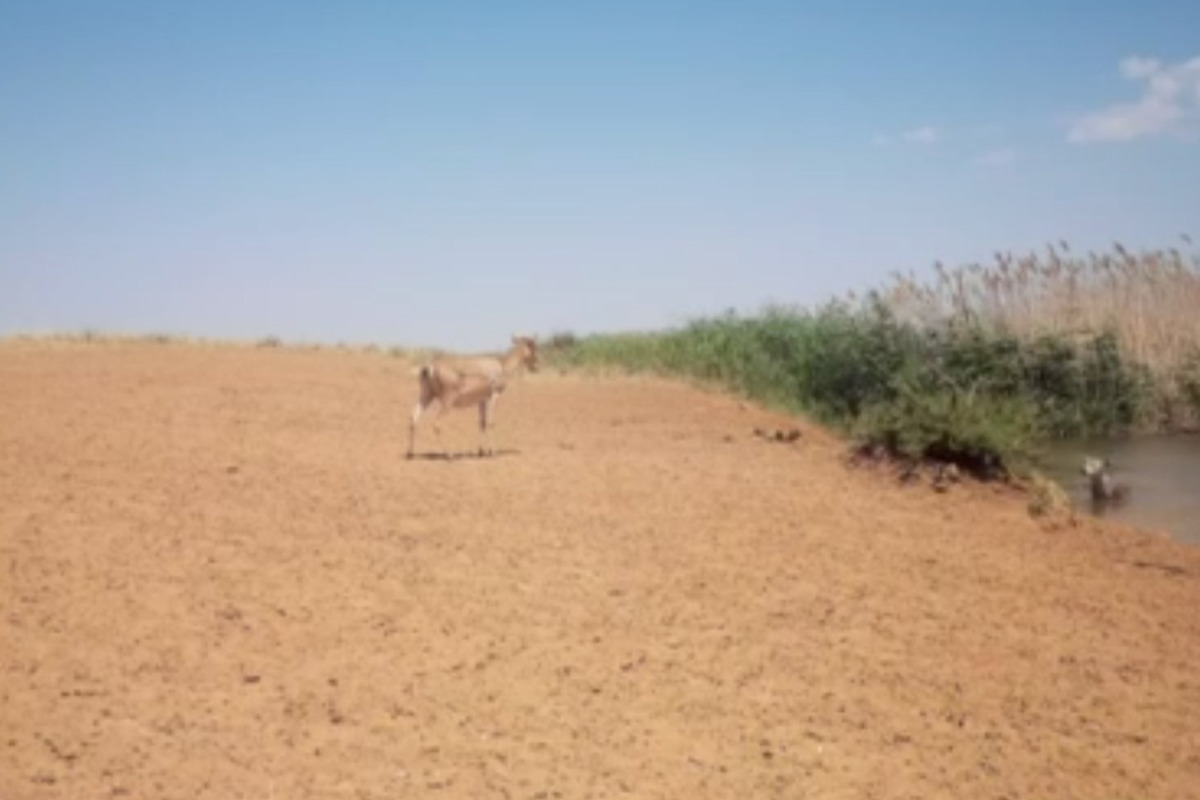 В заповеднике «Черные земли» установили фотоловушку у водопоя. На днях в кадры попала сцена встречи сайгаков и волка.