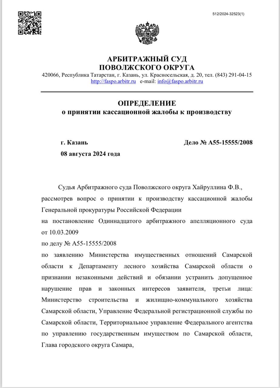 ⚡️Арбитражный суд Поволжского округа принял к производству кассационную жалобу Генпрокуратуры о возврате почти 8,2 тысяч га лесных земель в границах Самары, незаконно выведенных из федеральной собственности не без участия «золотого судьи» Александра Ефанова. Рыночная стоимость похищенных участков исчисляется сотнями (!) миллиардов рублей.