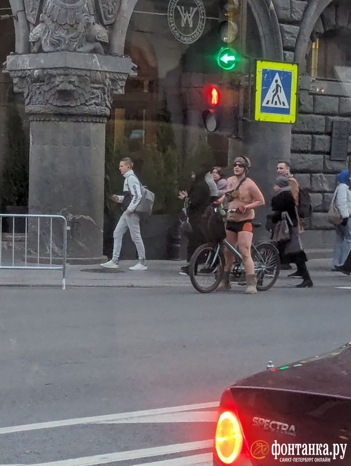 Вечером 8 мая на Невском проспекте заметили велосипедиста, одетого не вполне по погоде. Из верхней одежды на мужчине присутствовала только шапка, зато явно теплая. Фото «Фонтанке» прислала читательница.