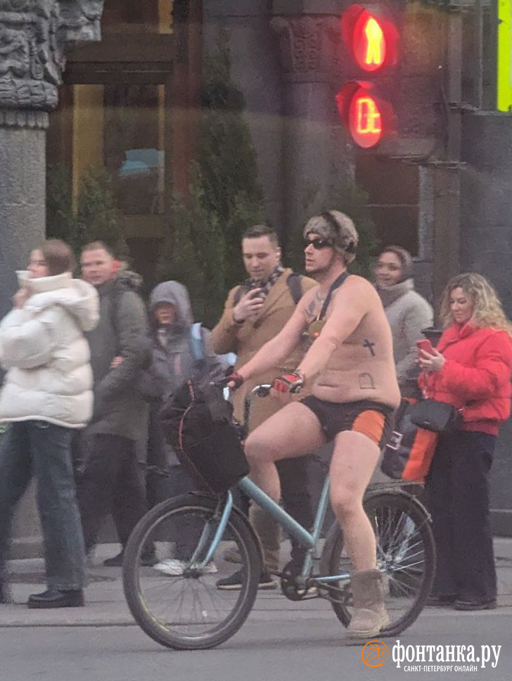 Молодой мужчина, несмотря на +2 градуса тепла на улице и периодически падающий снег, следует на велосипеде по Невском проспекту, одетый только в трусы, сапоги, меховую шапку, велоперчатки и солнечные очки.