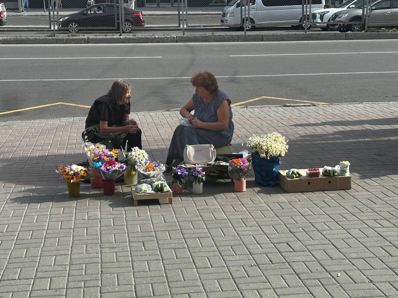 На углу Блюхера и Геодезической тоже не протолкнуться. Тут уличные торговцы оккупировали тротуар, так что теперь пешеходам приходится аккуратно лавировать между прилавками. Здесь продают свежие помидоры, редис и зелень.