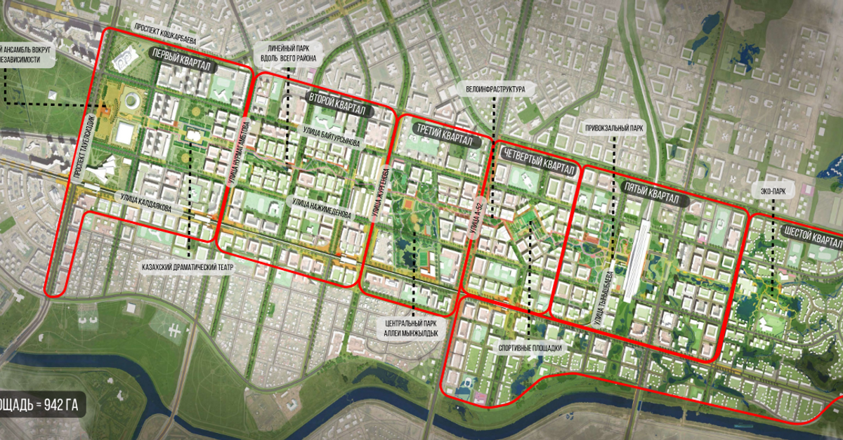 «Сейчас ведется активная застройка района. Параллельно с этим в прошлом году была привлечена британская архитектурная компания для разработки ландшафтного мастер-плана. Основной концепцией является создание единого линейного парка между улицами Байтурсынова и Нажимеденова, вдоль которого будут созданы различные точки притяжения в виде зеленых общественных пространств. Стратегия развития улиц направлена на создание человекоцентричных улиц с учетом уже имеющейся сетки улиц», - рассказали в управлении.