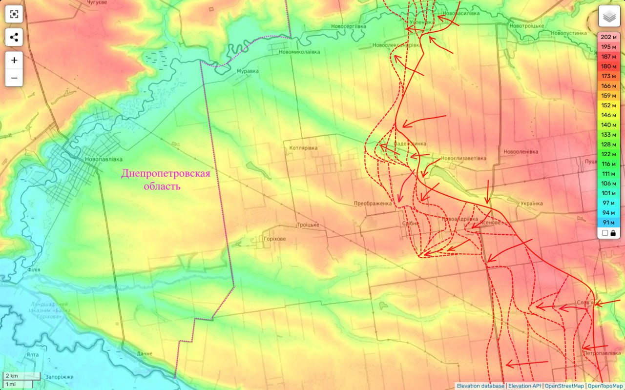 Здесь, за вчера почти без особых изменений. Есть продвижение юго-западнее Надеевки в сторону Преображенки-Котляровки.
