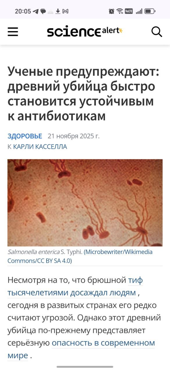 Бактерия вызывающая брюшной тиф за последние тридцать лет стала устойчива к большинству антибиотиков и в ближайшие 10-15 лет смертельные эпидемии этого заболевания могут представлять угрозу для человечества