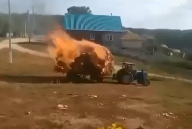 При этом огонь его никак не смущал, учитывая возгорание сена во время перевозки. Уточняется, что сгорела тонна сена, а водитель трактора не пострадал. В комментариях к ролику люди удивляются смелости этого человека.