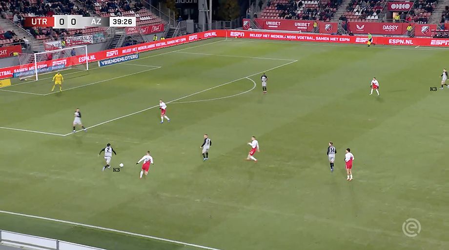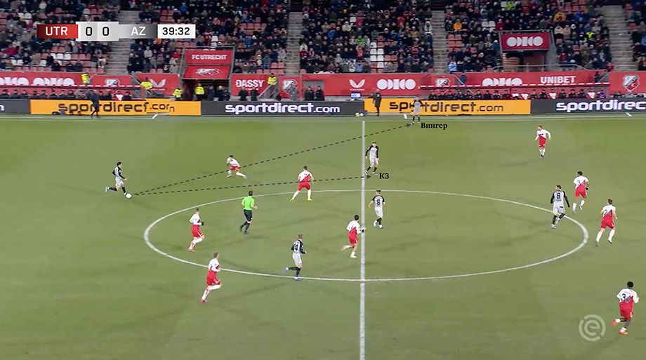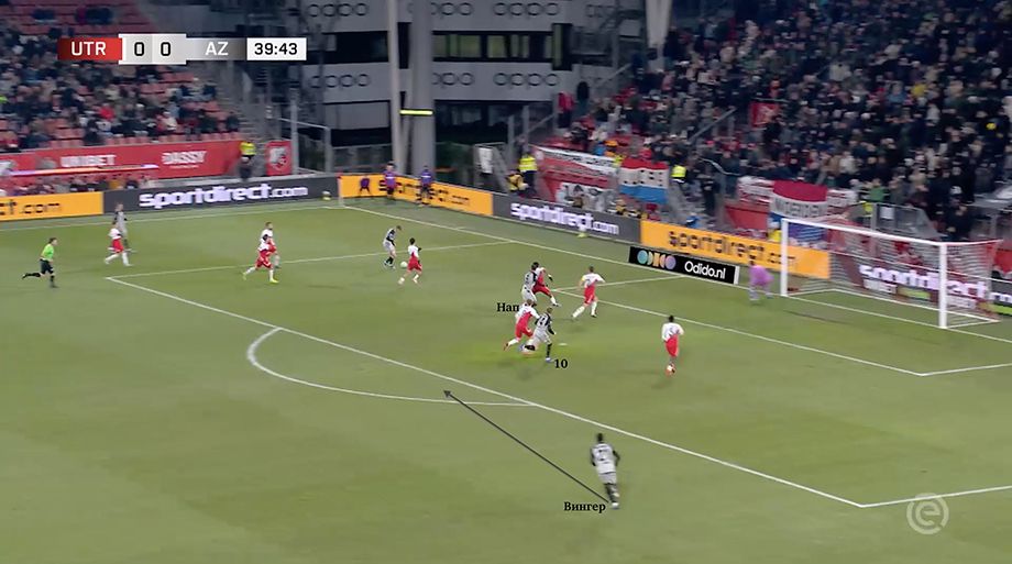 Передача на вингера (который вполне может быть инвертированным – АЗ регулярно их использует и продаёт) заставляет выдвигаться крайнего защитника соперника, а это открывает зону за его спиной. При этом ближнего центрального защитника сдерживает форвард АЗ, так что атаковать это небольшое пространство под проникающую передачу крайний защитник команды Янсена может беспрепятственно. Кроме того, потихоньку начинайте обращать внимание на «десятку» АЗ (№14), который помогал разбивать давление на своей половине поля.