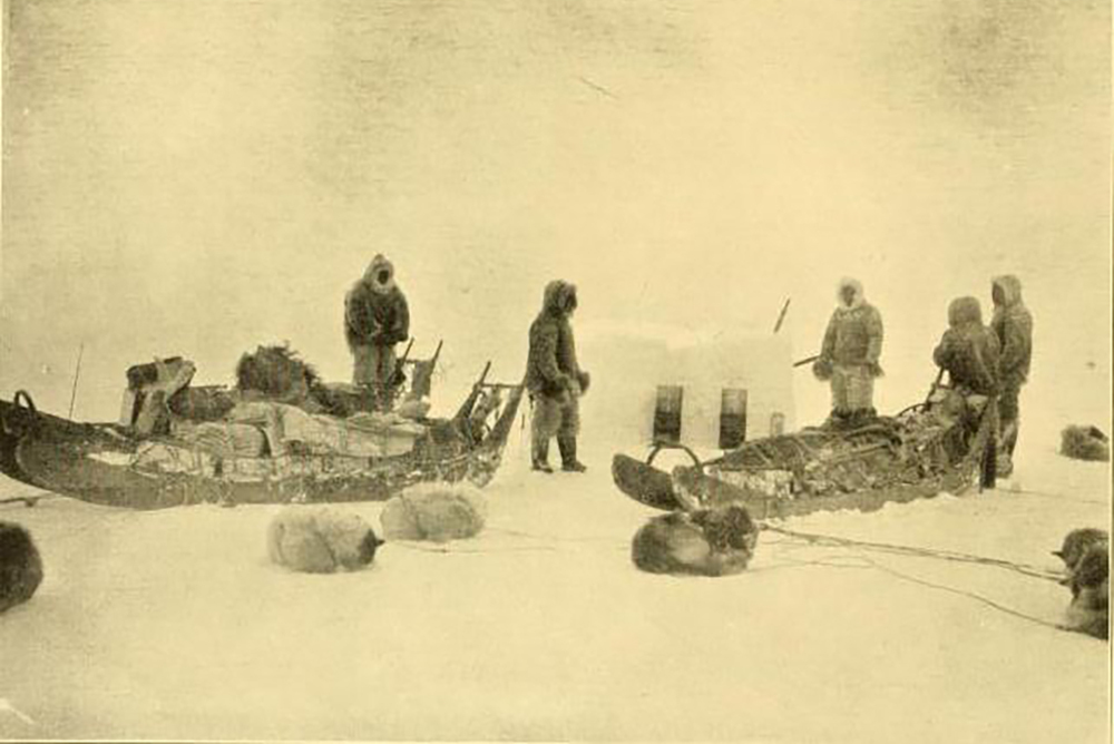 Отряд Пири располагается на привал и сооружает иглу. Хорошо видны нарты конструкции Пири. Фото 1909 года. Фото: Wikipedia.org