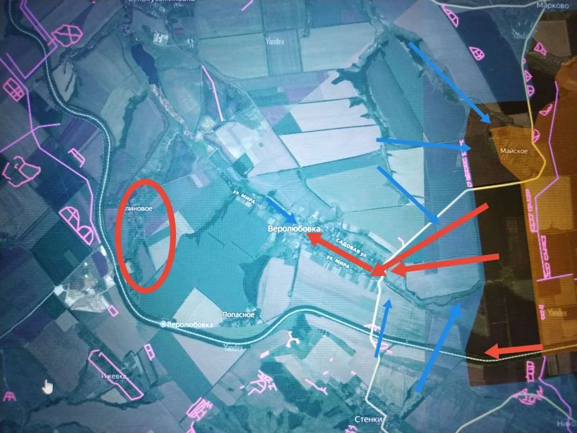 Северо-западнее противник контратакует в направлении Майского с северо-запада и юго-запада, пытаясь окружить наши подразделения в районе Веролюбовка - Клиновое - Безыменное и восстановил контроль над опорным пунктом западнее Майского и дорогой между Майским и Веролюбовкой.