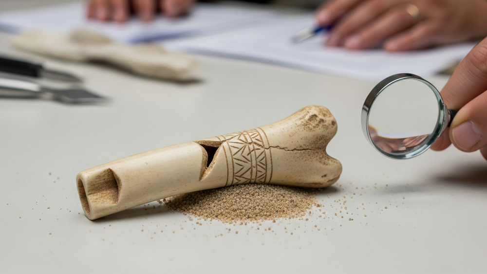 Чтобы подтвердить назначение предмета, исследователи использовали цифровую микроскопию и макрофотографию, изучая износ и следы на поверхности. Также была изготовлена точная копия из кости современной коровы. Когда дуют в отверстие, слышен громкий, резкий звук, который легко мог использоваться для подачи сигналов охране.