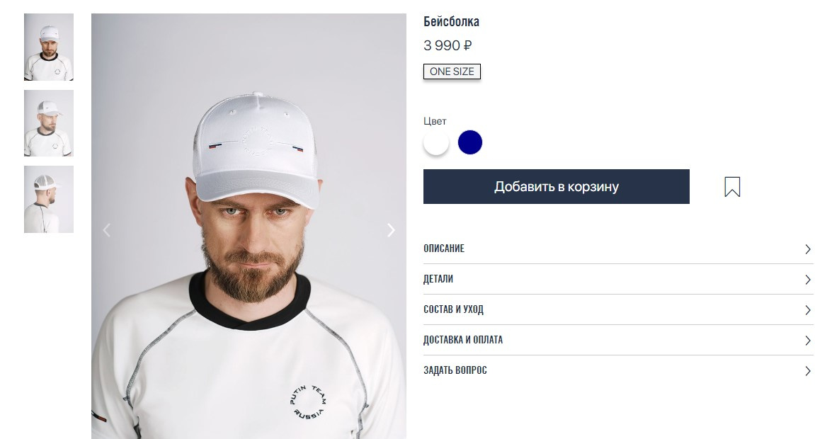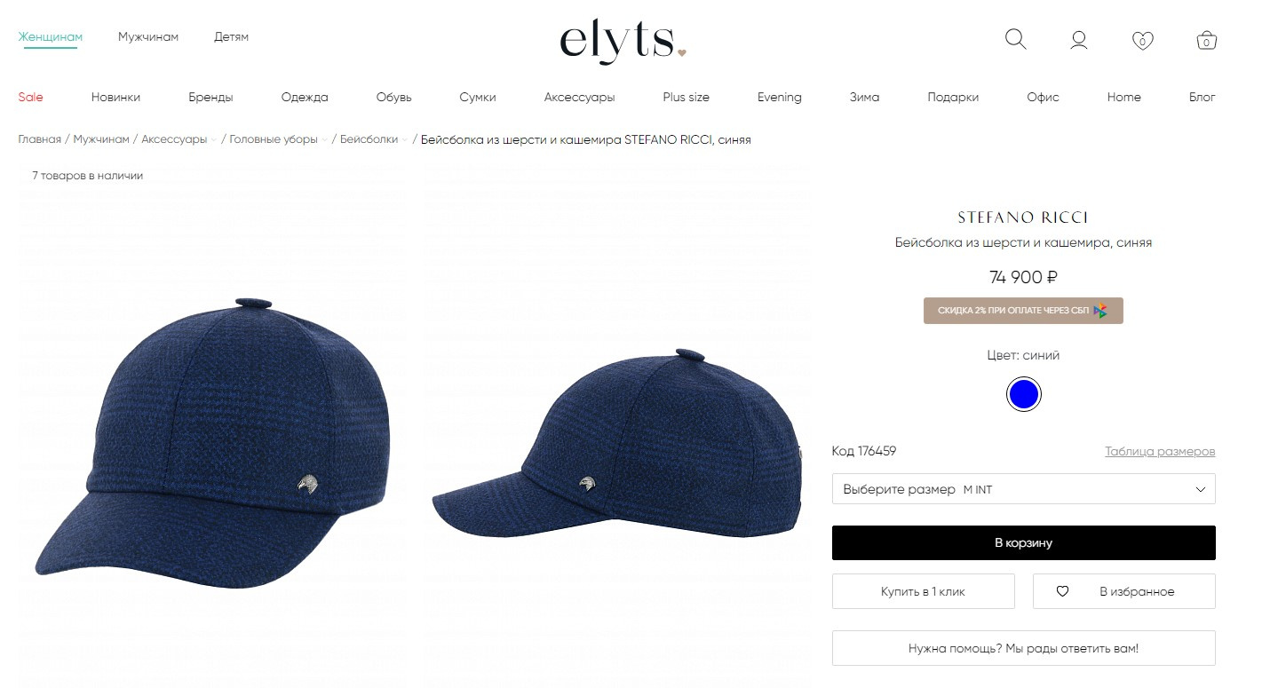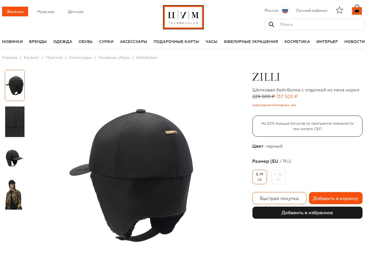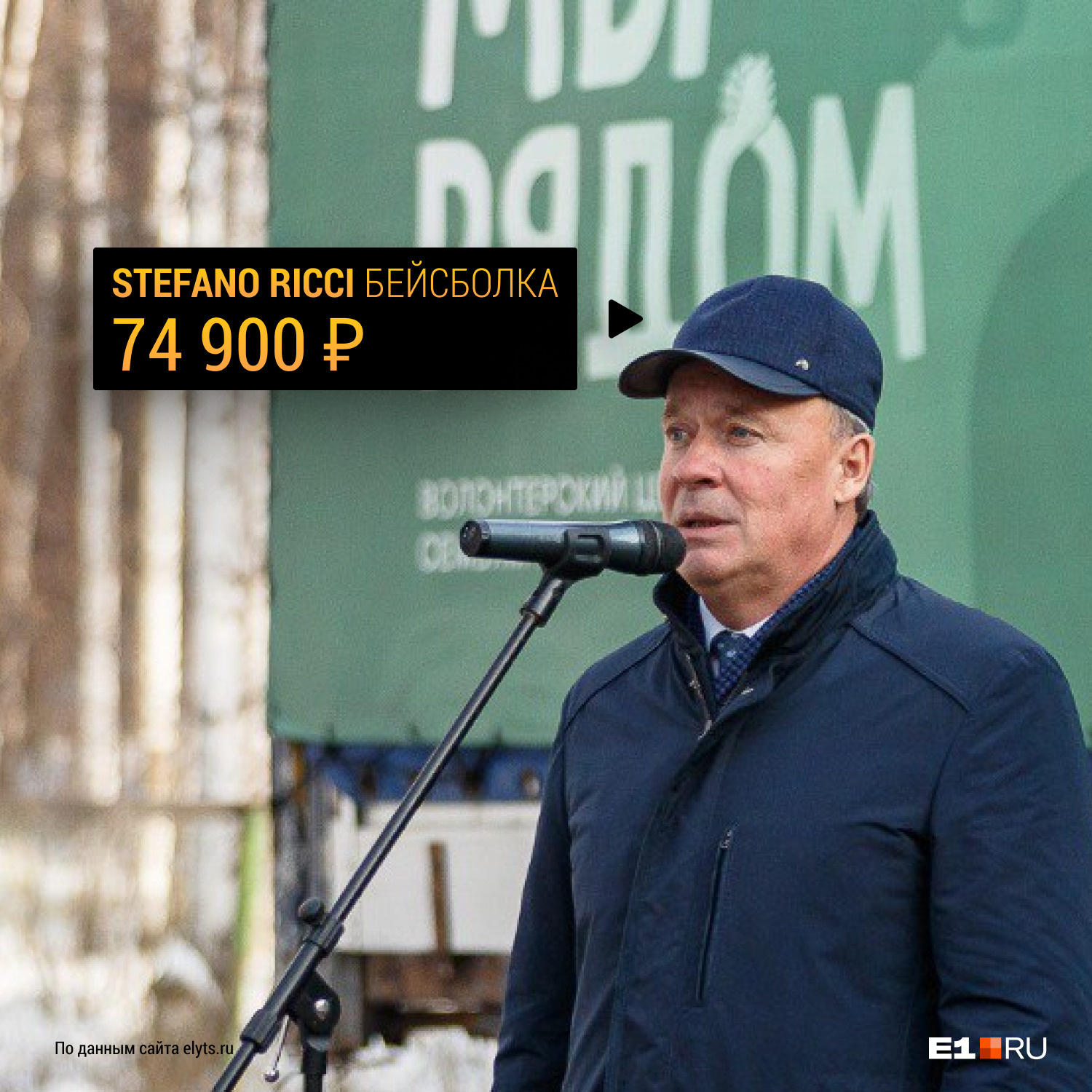 Другая бейсболка — демисезонная из шерсти и кашемира от итальянского бренда Stefano Ricci. Этот головной убор не перепутать с другими марками, так как у козырька есть металлический королевский орел — эмблема бренда. В ней мэр ходил вплоть до конца ноября, в том числе выезжал на проверку детских лагерей. Цена кепки в Elyts —