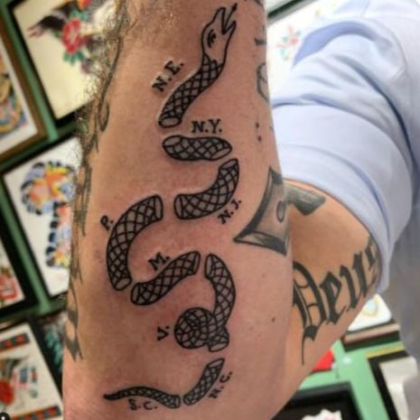 2) Змея "объединяйся или умри", символ борьбы американских колоний за независимость от британской короны; в том смысле, что поодиночке штаты как разрубленная змея, а вместе — кусачий союз.