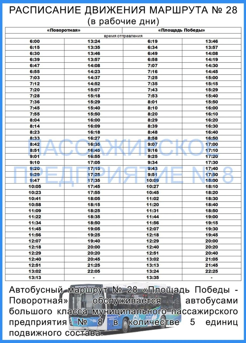 Автобусы будут следовать от конечной остановки «Поворотная» до остановки «Площадь Победы». В основном машины будут ходить каждые 10 минут в рабочие дни. Время курсирования от «Поворотной» — с 6:00 до 22:05. Реже автобус ходит с 6:00 до 6:30, в послеобеденное время (с 14:08 до 15:07) и в вечернее время (с 18:35 до 22:05). Время курсирования от «Площади Победы» — с 6:19 до 22:25.