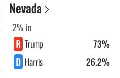 После обработки 2% голосов у Трампа – 73%, у Харрис – 26,2%.