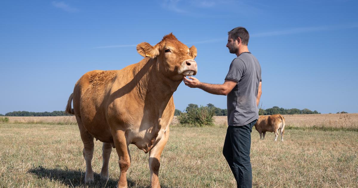 À 37 ans, celui-ci est à la tête d’une exploitation de 430 hectares, intégrée à l’entreprise familiale de 850 hectares. Fils et neveu d’éleveurs, il a grandi avec les bêtes. «J’ai toujours été dans le milieu agricole, puisque la ferme appartient à mes grands-parents maternels depuis 1976. Ce métier, les animaux, les fermes, c’est ma passion depuis tout petit. Les week-ends, les vacances, ou dès que j’avais du temps libre, je venais à la ferme avec mon père, je le regardais travailler et je l’aidais». Après un bac scientifique dans un lycée agricole, un BTS en production animale puis une licence métiers du conseil en élevage bovin, il s’installe en 2010 dans la ferme familiale, et s’associe avec son père, deux oncles et deux cousins. En 2022, ils se séparent et Alexandre Humeau reprend l’élevage de ses vaches-mères. «La raison est toute simple : un de mes oncles ne voulait pas faire de vache, mais moi c’était ma passion.»
