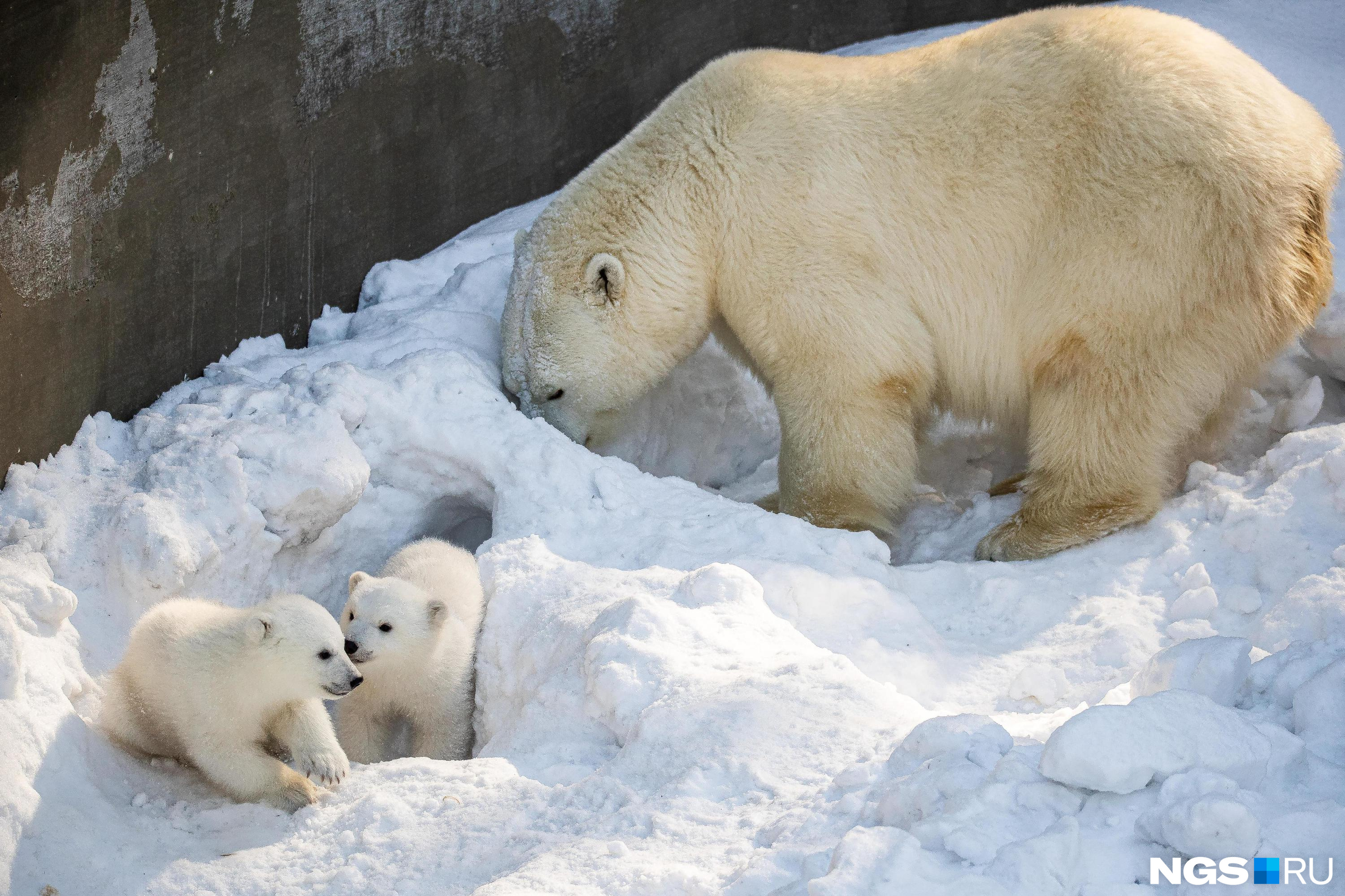 В Новосибирском зоопарке сейчас шесть белых медведя. Кай и Герда находятся в зоопарке с 2008 года. Медвежата Норди и Шайна родились у них в 2018 году. В этом году родились новые медвежата — Белка и Стрелка.