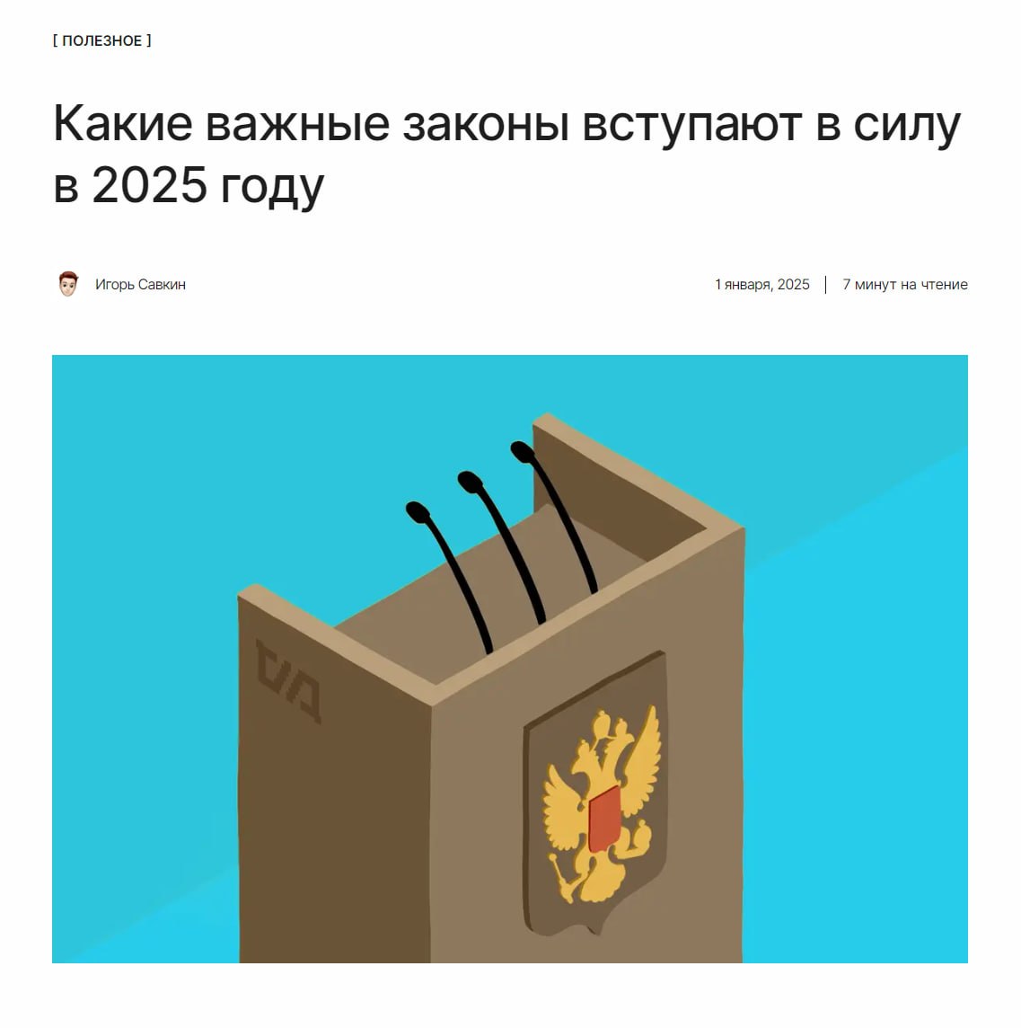 Вот и наступил 2025 год. По традиции мы собрали для вас нововведения в законодательстве, кратко пересказываем самые важные законы и поправки, которые вступят в силу в этом году — в статье.