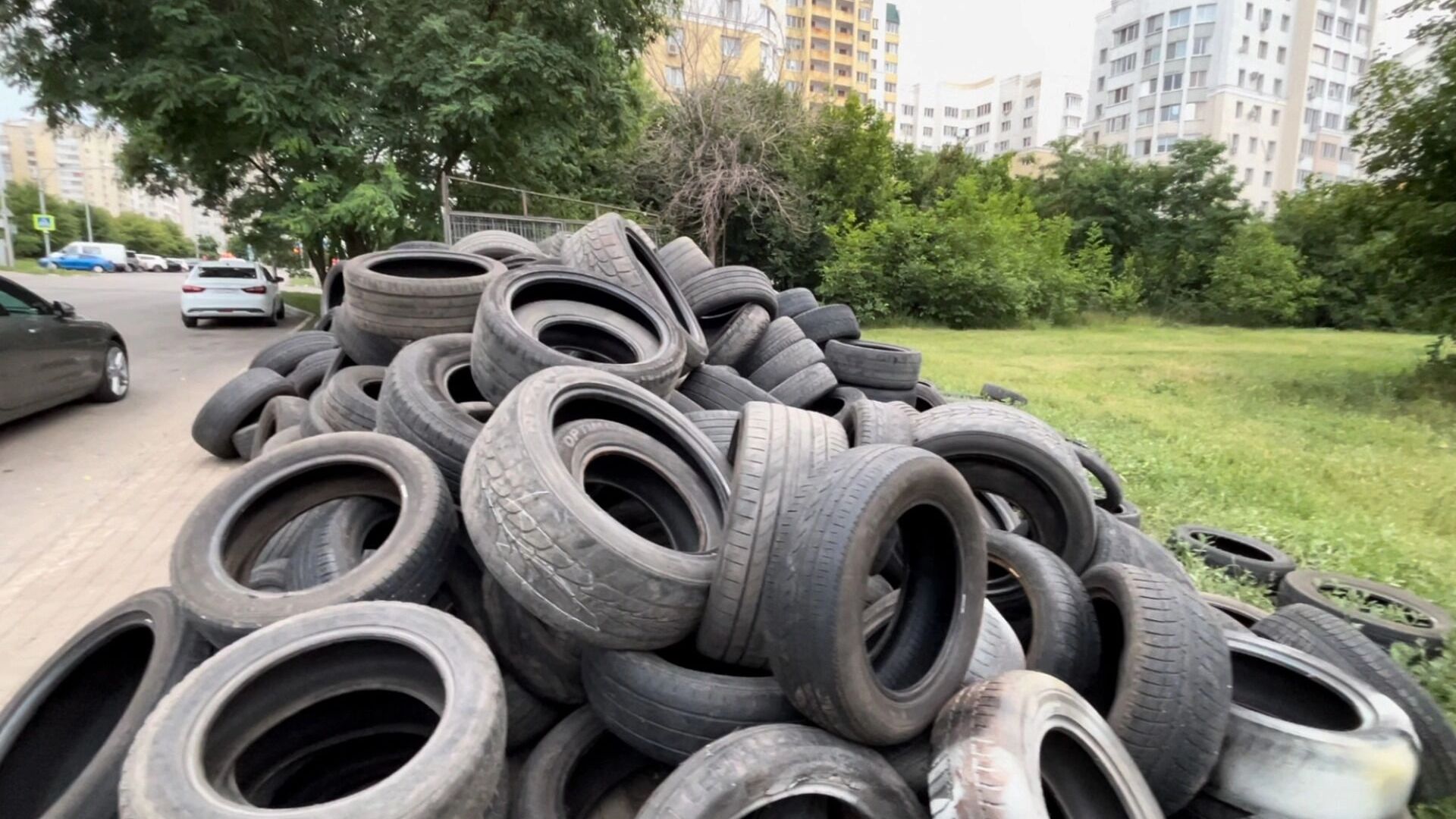 Этот пункт обозначен как официальный на карте Центра экологической безопасности. Однако по факту он больше напоминает стихийный склад: шины не только заполнили тротуар, но и валяются на траве за территорией.
