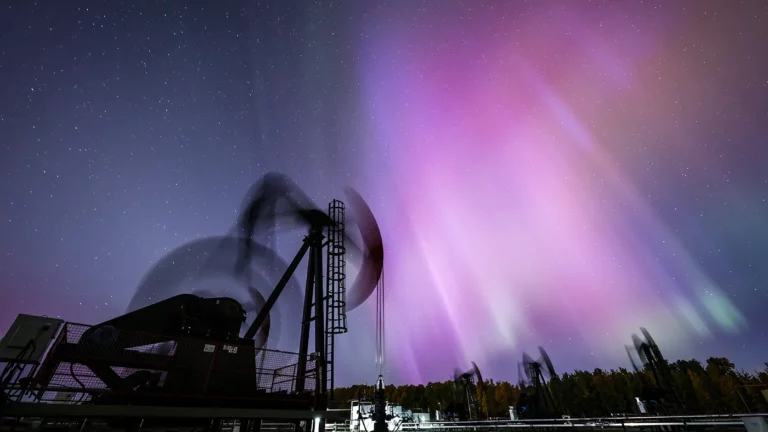 11 октября 2024 года, Кремона, штат Альта, провинция Альберта, Канада. Северное сияние (aurora borealis) переливается в небе на фоне работающих насосов, которые выкачивают нефть из скважин. Канада занимает третье место в мире по запасам нефти и четвертое — по ее добыче.