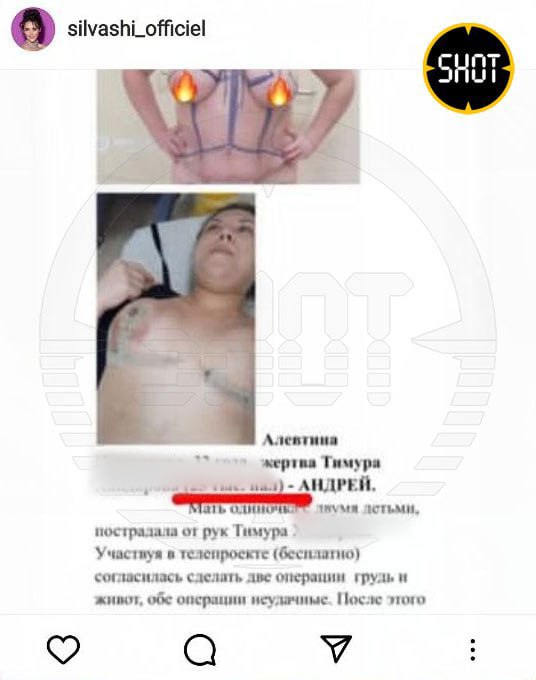 На днях Алевтина увидела свои фото в формате до/после в запрещённой "инсте" у жены пластического хирурга Тимура Хайдарова Светланы Сильваши — на них было видно лицо девушки и написаны все её личные данные.